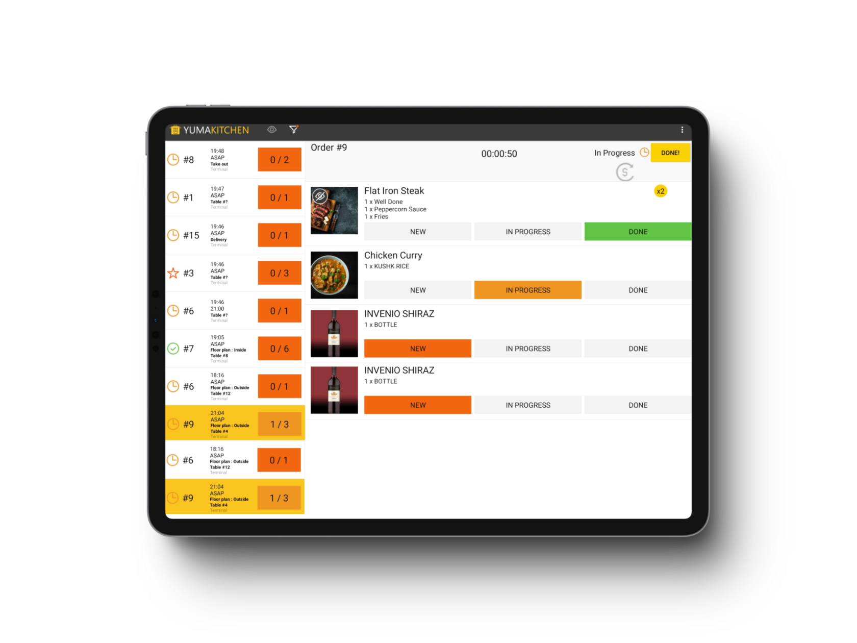 Update meal preparation status with a tap. Once ready, staff marks it as "Done" and waiters get notified.
