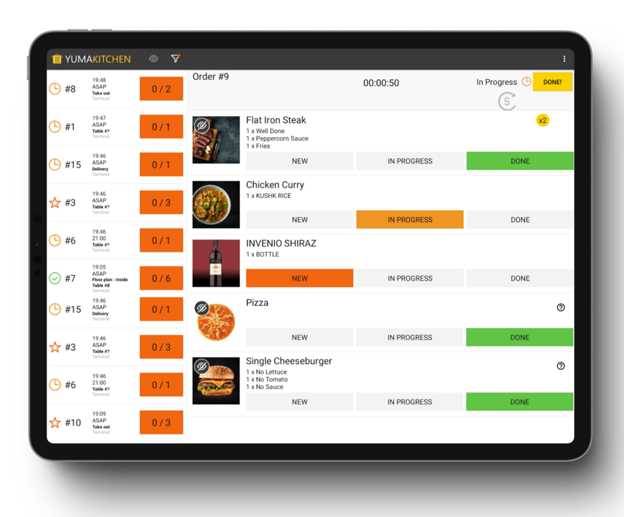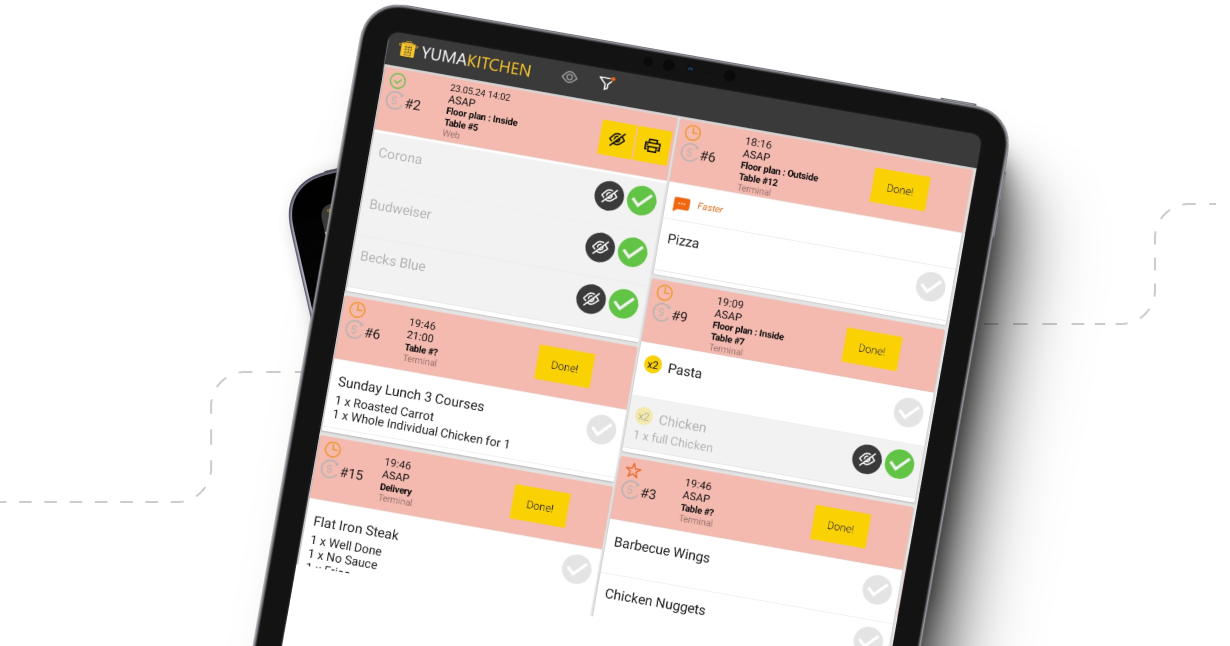 Our Kitchen Display System is wireless and easy to set up. A tablet or smartphone is all you need to use it.